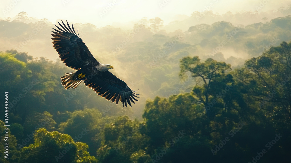 Majestic eagle soars above a misty, verdant forest, sunlight catching its wings #1766398661