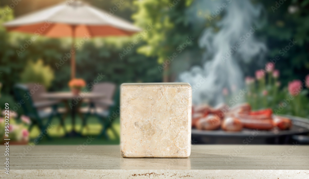 Marble podium on table with garden barbecue background – summer lifestyle product mockup. Garden setting with barbecue elements with warm and relaxed outdoor atmosphere. Spring or summer vibes. #1953022209