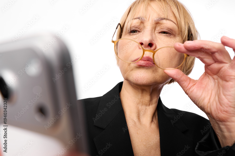 Mature woman in black jacket removes glasses while looking at smartphone with serious expression. Concept of vision correction, technology use, and focused attention on screen. #1940342324