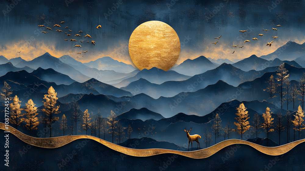 Mesmerizing 3D Modern Art Mural Wallpaper Featuring Dark Blue and Golden Wave Background with Majestic Mountains, Elegant Golden Deer, and Graceful Birds #1087172455