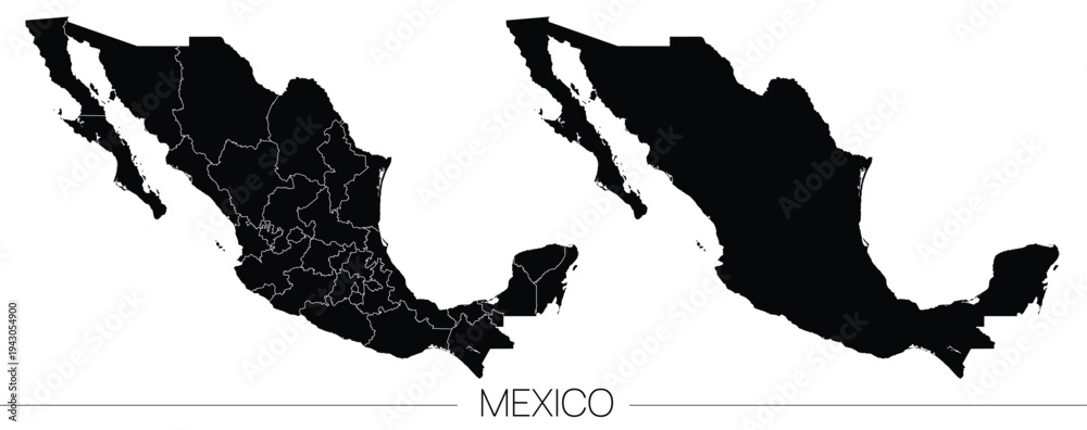 Mexico administrative map with states and borders, vector illustration of black silhouette of country isolated on white background #1943054900