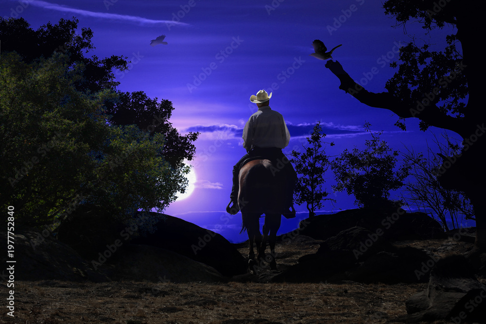 Midnight cowboy traveling by horseback at night. Includes a dark blue background with the moon glowing behind the brush and several bird flying. #1977752840