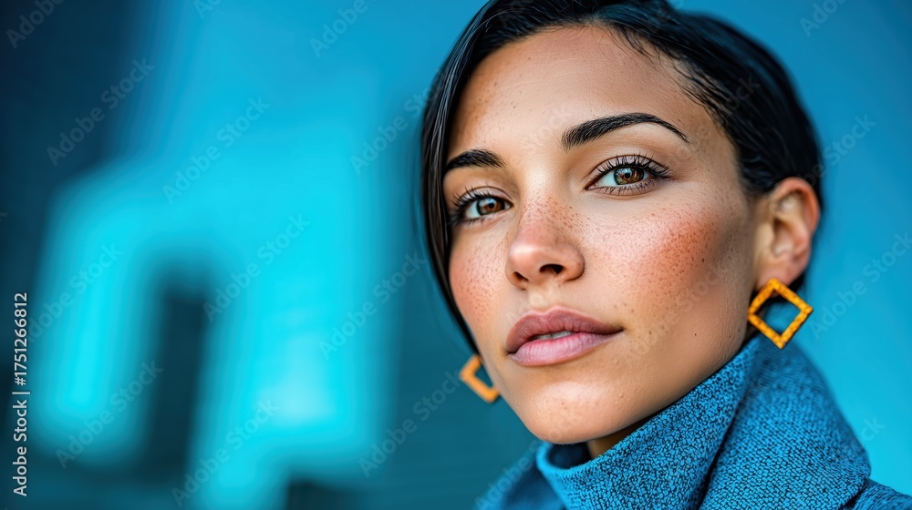Minimal portrait of woman in teal sweater with geometric yellow earrings against soft cyan backdrop for unique jewelry and fashion branding.#1751266812