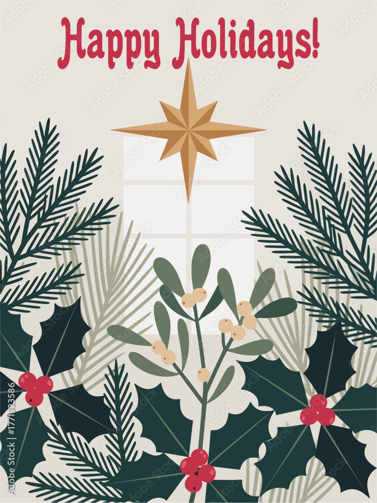 Minimalist holiday greeting card with “Happy Holidays!” text, golden star, pine branches, palm fronds, mistletoe, and holly berries on a warm beige background in a modern festive style. #1771323586