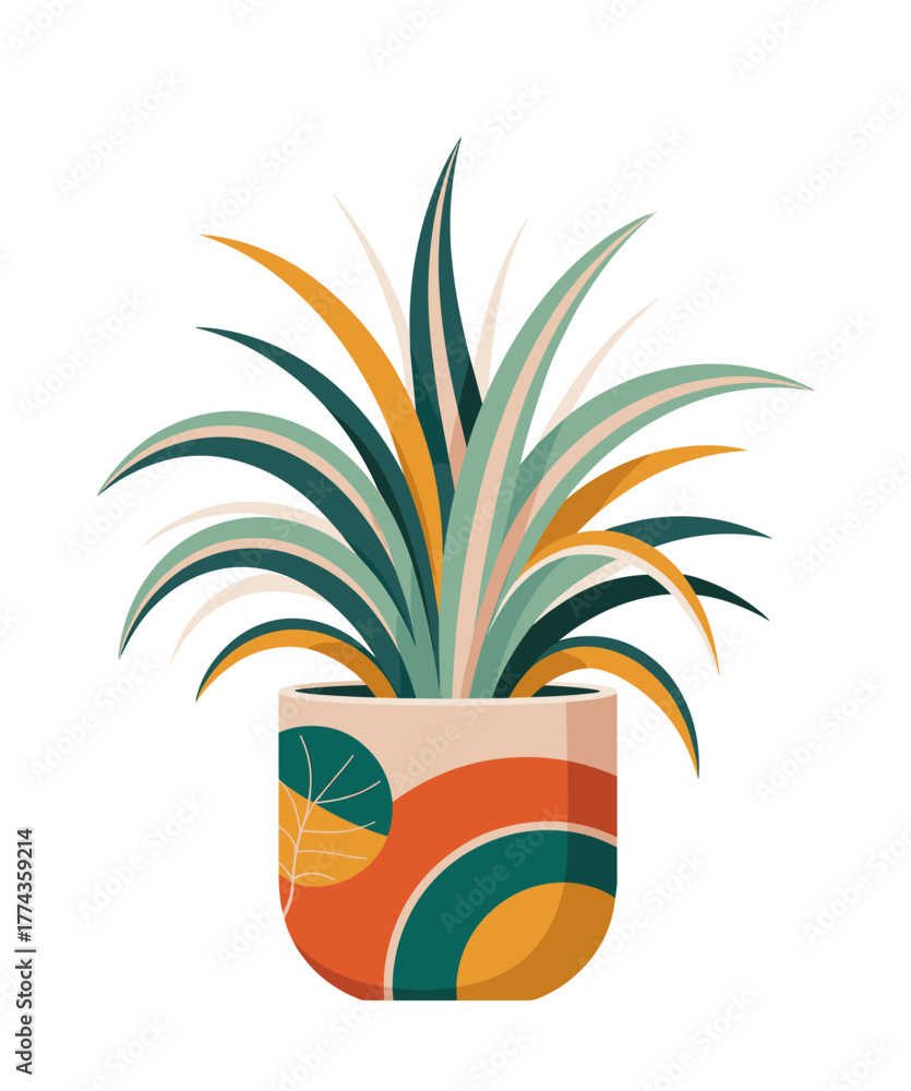 Minimalist vector illustration of a teal, yellow, and beige potted plant with flowing leaves in a retro-modern pot featuring geometric patterns, set against a white background with a gray frame. #1774359214