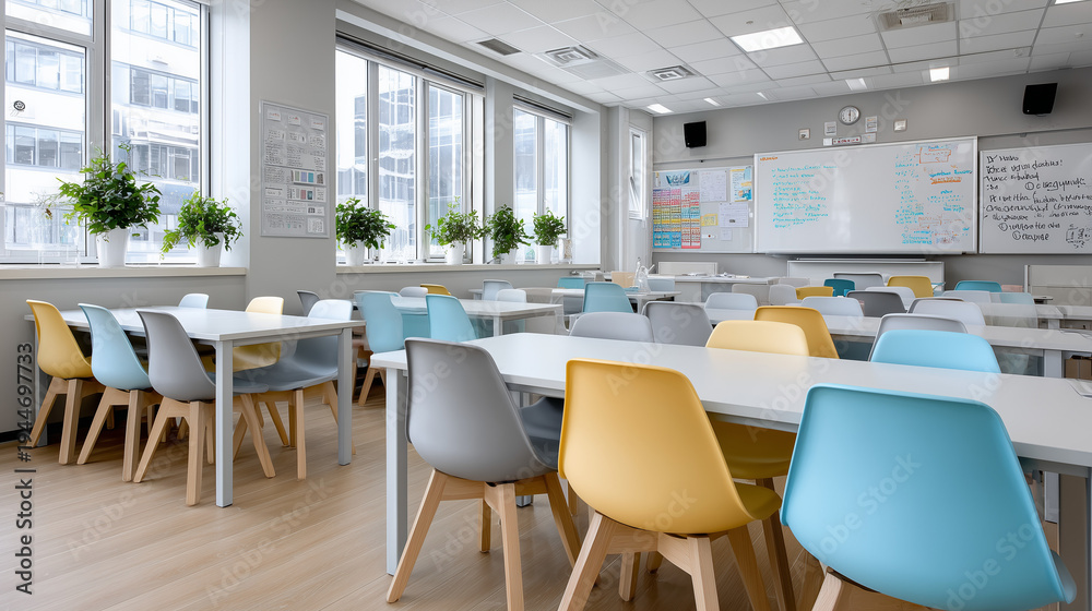 Modern Empty Classroom with Colorful Desks and Natural Light#1944697733