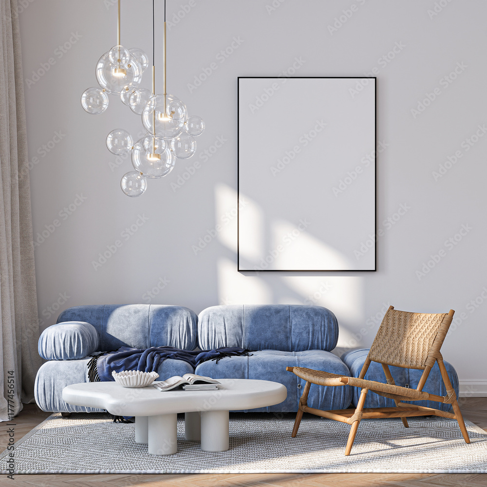 Modern Living Room Poster Frame Mockup with Natural Light and Minimalist Decoration. 3D render. #1777456514