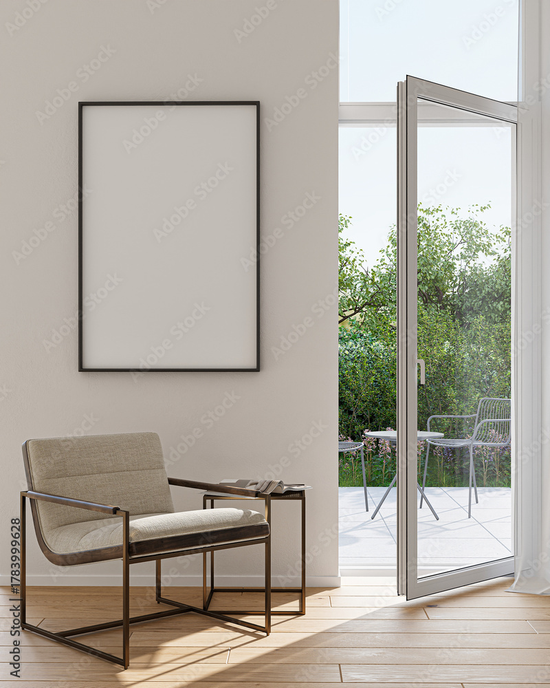 Modern Living Room Poster Frame Mockup with Natural Light and Minimalist Decoration. 3D render. #1783999628