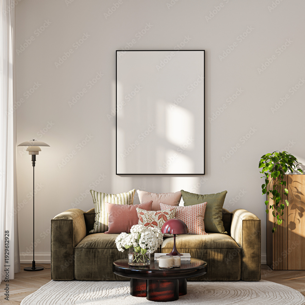Modern Living Room Poster Frame Mockup with Natural Light and Minimalist Decoration. 3D render. #1929612928