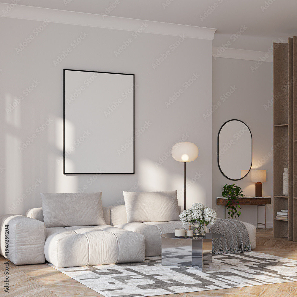 Modern Living Room Poster Frame Mockup with Natural Light and Minimalist Decoration. 3D render. #1947291204