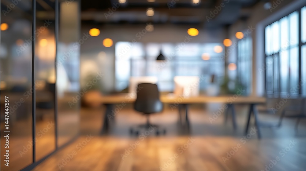 Modern office workspace interior design blurred background abstract desk room dark wood gray chair #1447447597