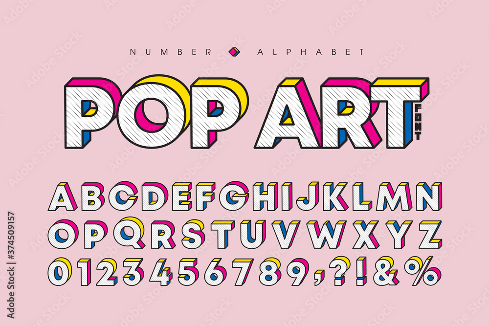 Modern pop art 3 dimensional letters and number set. Stylish bold font or typeface for headline, title, poster, web design, brochure, layout or graphic print. Flat vector 3D alphabet & number. #374509157