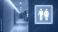Modern restroom sign illuminated in a hotel hallway #1957578372