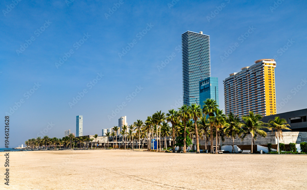 Modern skyscrapers and lush palm trees along the sandy Jeddah waterfront under a clear blue sky in Saudi Arabia #1946121628