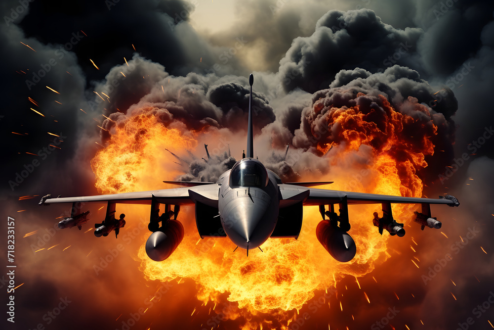 Modern stealth fighter plane. Flight in formation, flyby and landing, take off bombing, dog fight, firing missile. #718233157