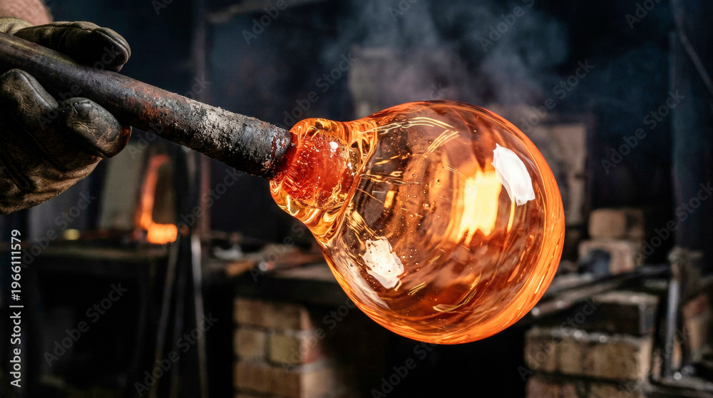 Molten glass being shaped on a blowpipe in a glassblowing studio #1966111579