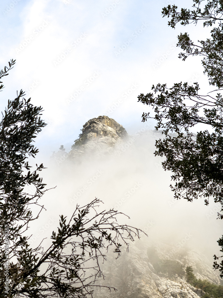 Mountain peak framed by trees emerging through low morning fog #1780468767