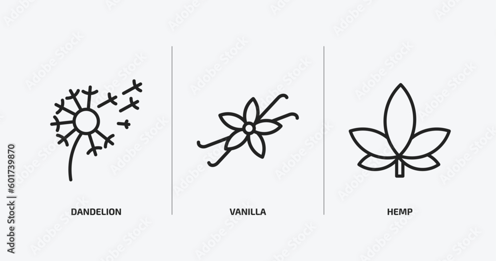 nature outline icons set. nature icons such as dandelion, vanilla, hemp vector. can be used web and mobile. #601739870