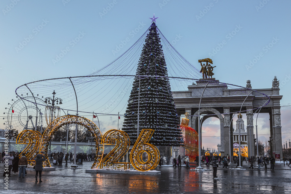 New Year's decorations at the central entrance to the VDNKh (All-Russia Exhibition Centre). Moscow, Russia. #1888633804