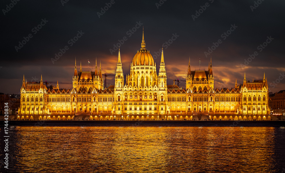 Night view of Budapest Parliament glowing over the Danube river, Hungary #1744420834