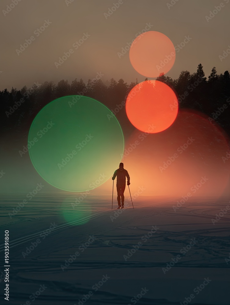 Nordic skier at dawn, body reduced to line, breath dissolving into green white red haze, five circular light echoes #1903591800
