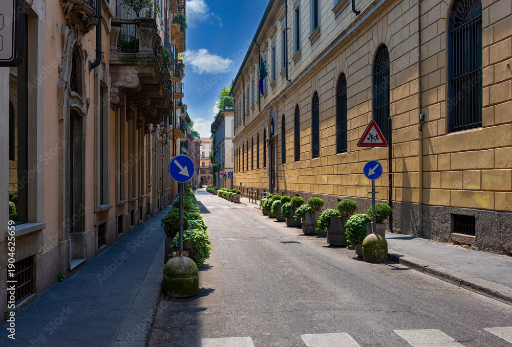 Old narrow street in Quadrilatero della moda in Milan, Italy. Cozy cityscape of Milan. Architecture and landmarks of Milan. #1904625659