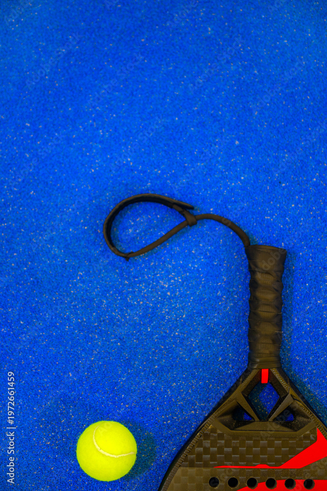 Padel tennis racket with ball. Background with copy space. Sport court and ball. Download a high quality photo with paddle for the design of a sports app or social media advertisement #1972661459