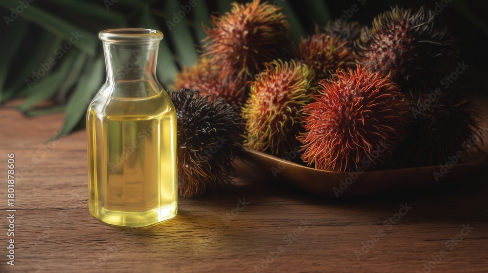 Palm oil in glass bottle with palm fruits. Generative AI #1801878606