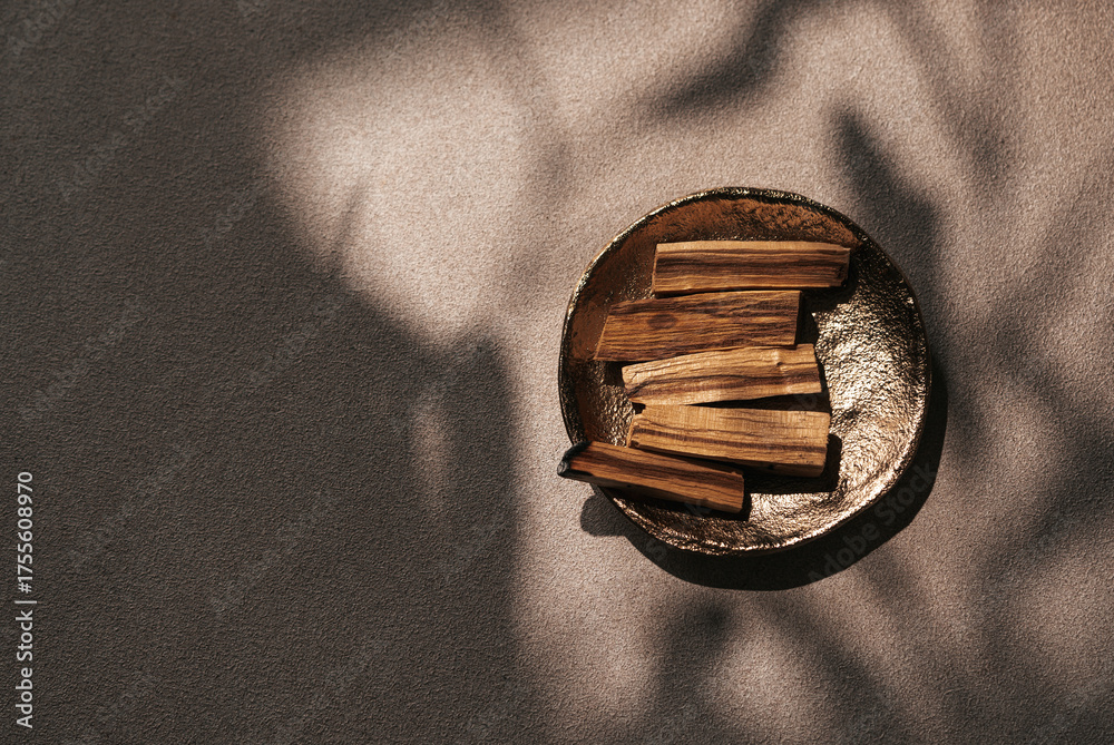 Palo Santo sticks on golden plate, illuminated by artistic shadows of leaves. Combination of organic textures and moody lighting enhances the feeling of tranquility and ritualistic energy. Cropped. #1755608970