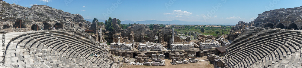 Panoramic photo of Antique stone theatre in the city of Side, Turkey #1800122024