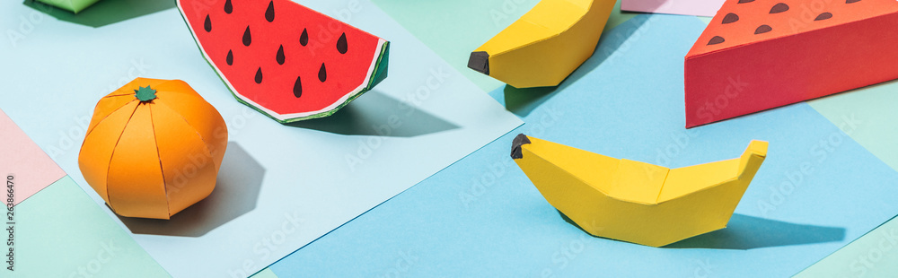 panoramic shot of handmade cardboard fruits on multicolored paper #263866470