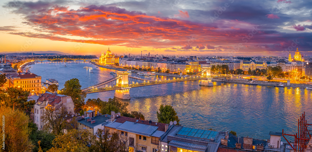 Panoramic view over Szechenyi Chain Bridge, Danube River and Parliament building in Budapest, Hungary. #1750833569