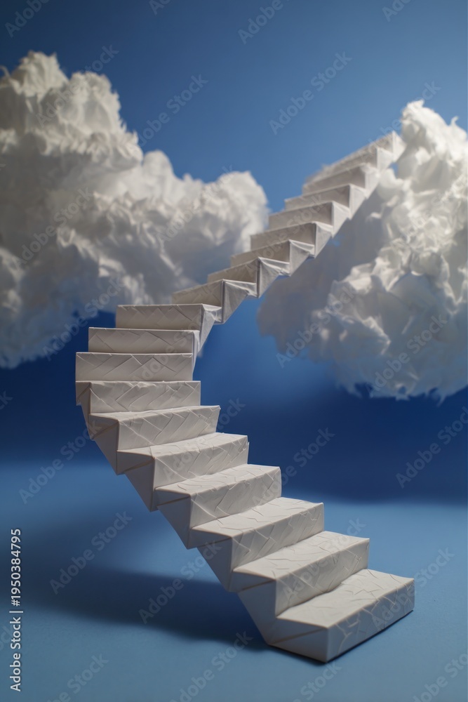 Paper origami staircase disappearing into abstract sky, surreal minimalist concept about aspiration and imagination. #1950384795