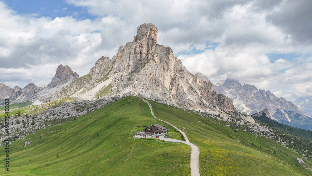 Passo Giau, Giau pass, drone view above alpine meadow with rustic mountain hut towards the famous rock formation, summit at Giau passo. Some hikers on the trail, summer day. Beautiful nature. #1929340282