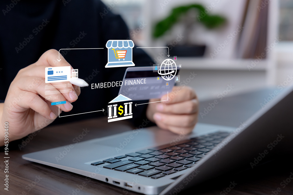 Person using credit card and laptop with embedded finance interface for digital payment, e-commerce checkout, online banking, and fintech transaction services. #1945390400