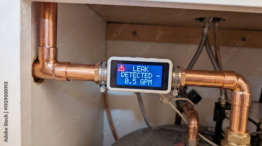 Plumbing leak detection system displaying an alert on a copper pipe installation #1929000913