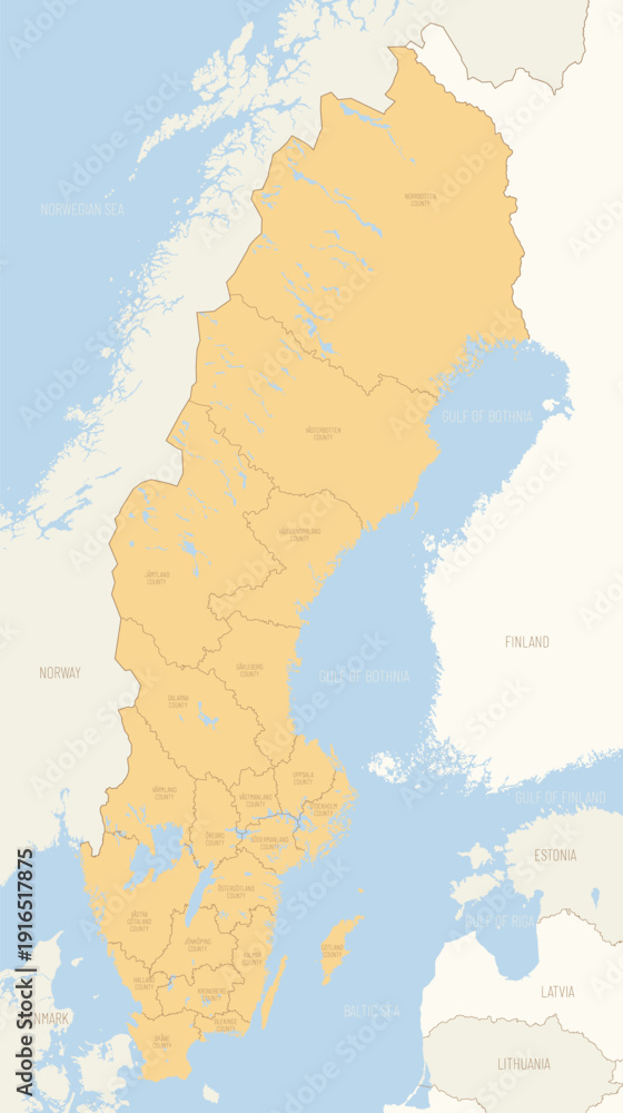 Political map of Sweden showing regions and borders of neighboring Scandinavian and Baltic European countries #1916517875