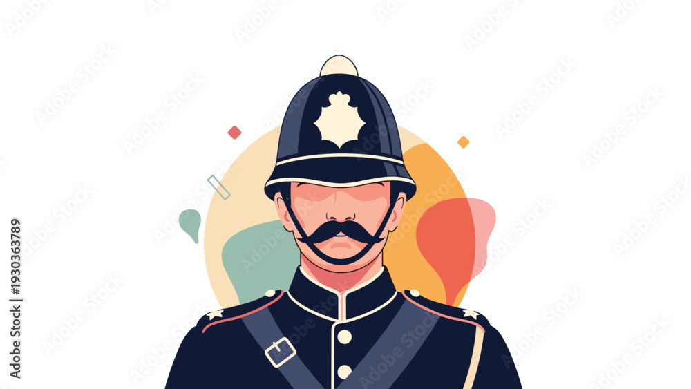 Portrait of a traditional British police officer wearing a classic bobby helmet and uniform with a distinctive large black mustache. #1930363789