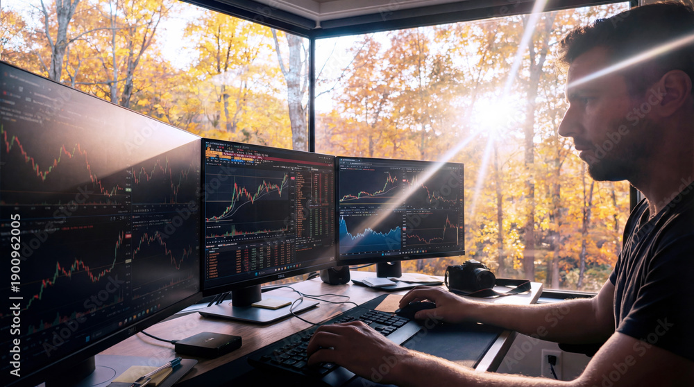 Professional day trader working on multi-monitor setup in modern home office. Male stock market analyst monitoring financial graphs and data charts at sunset with autumn forest view background. #1900962005