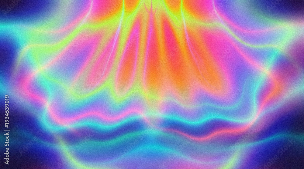 Radiant neon flower mandala with symmetrical glowing petals in orange-pink-yellow-green-blue-purple gradients. Conceptual vector illustration for trippy psychedelic symmetry and vibrant aura designs. #1934539019