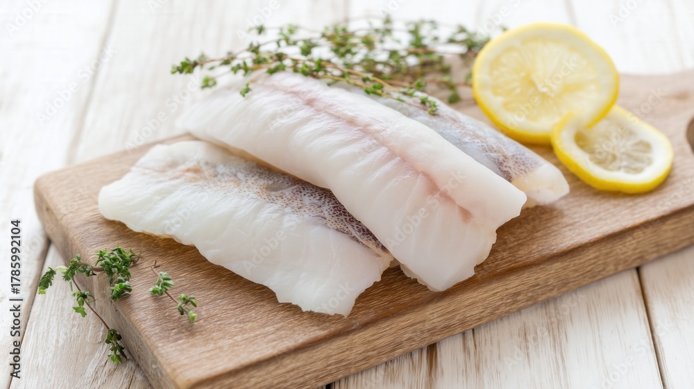 Raw whitefish fillets with lemon and herbs on white background isolated. Generative AI #1785992104