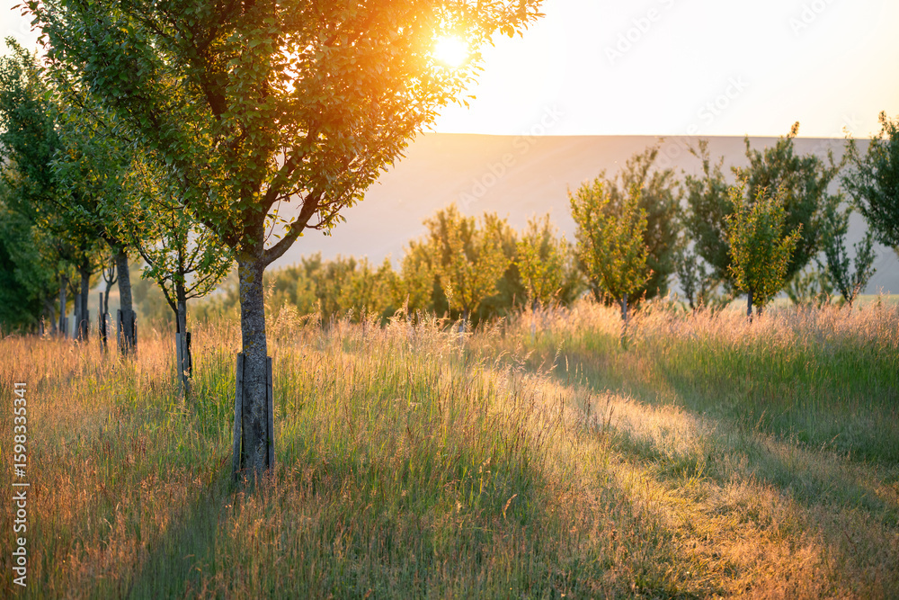 Real photograph of morning in the orchard. Old trees in the meadow with the sun rising behind. #1598335341