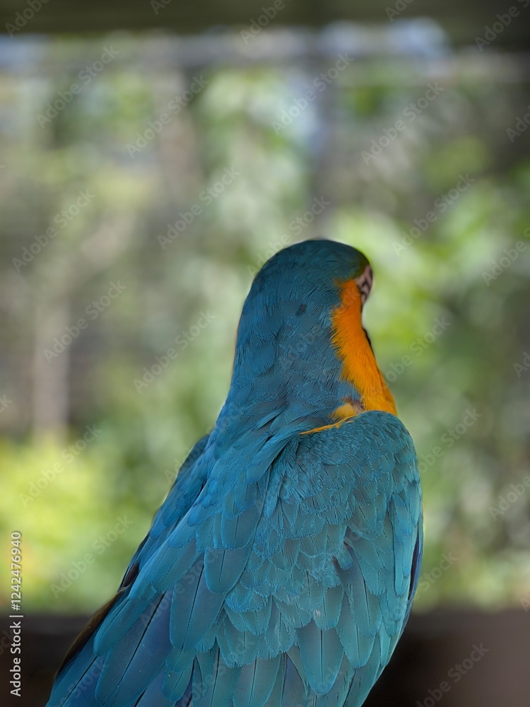Rear View Close Up of a Blue and Gold Macaw. Stunning Feathers and Vivid Colors #1242476940
