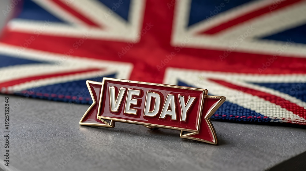 Red and gold ve day pin badge placed over union jack fabric to honor military service and historical peace agreement after conflict with shallow depth of field for elegant focus #1925132848