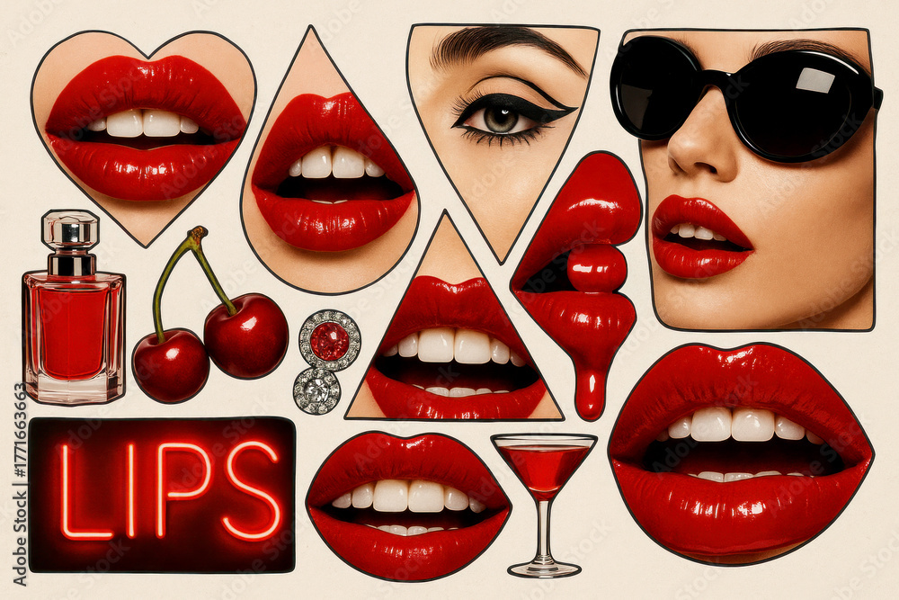 Retro fashion collage with red lips eye sunglasses perfume and cocktail in pop art style for scrapbook, junk journal, poster, sticker, banner design. #1771663663
