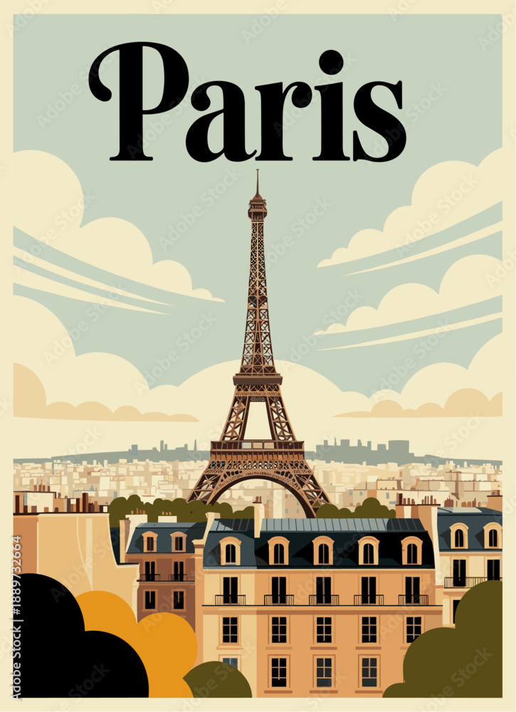 Retro travel poster of Paris featuring the Eiffel Tower above Haussmann rooftops, cream sky, muted blues and olives, flat vector mid-century modern tourism style. #1889732664