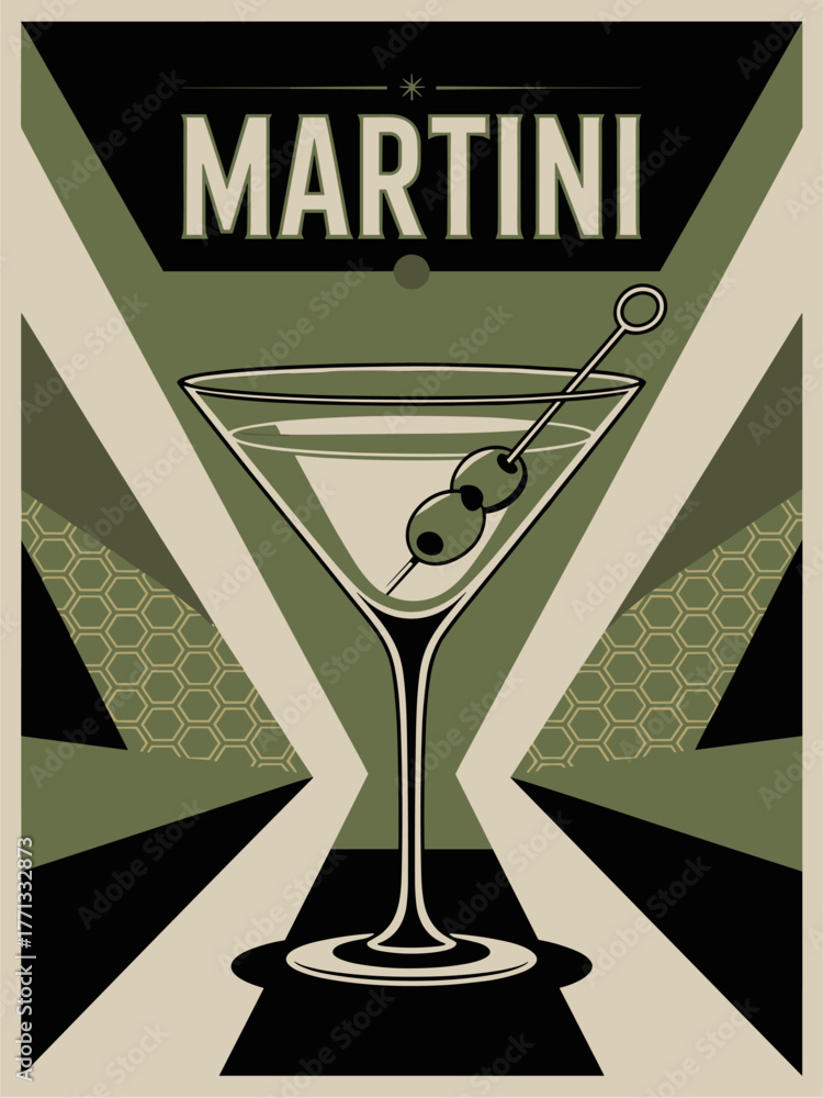Retro vector Martini cocktail poster featuring a sleek glass with olives, geometric background in olive, beige, and gold, vintage mid-century typography, sophisticated stylish design #1771332873