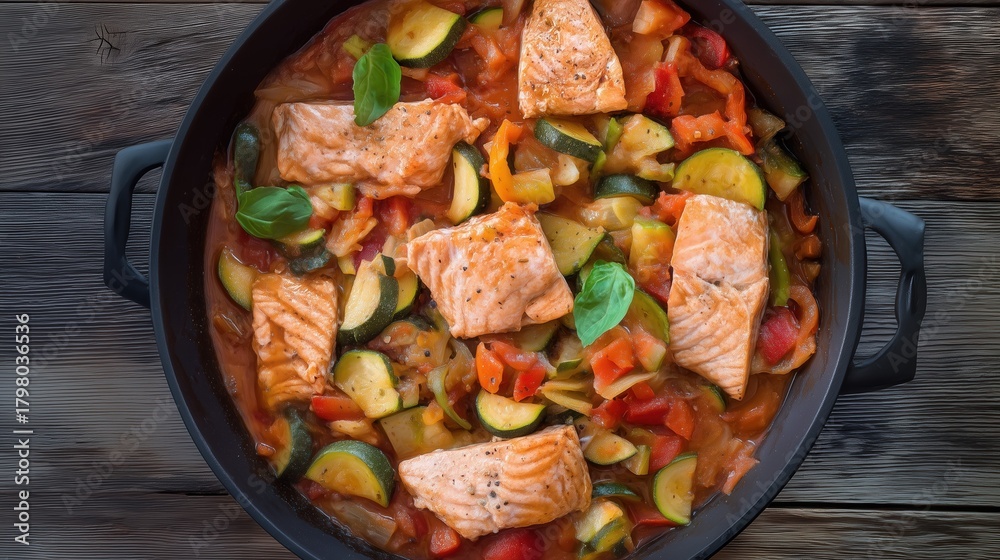 Salmon Stew with Zucchini and Vegetables in a Pan. Generative AI #1798036536