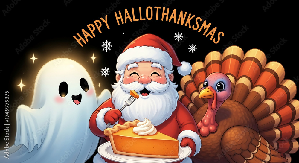 Santa, ghost, and turkey enjoy pumpkin pie, celebrating a combined Hallothanksmas holiday, showcasing festive spirit and autumnal flavors #1749779375
