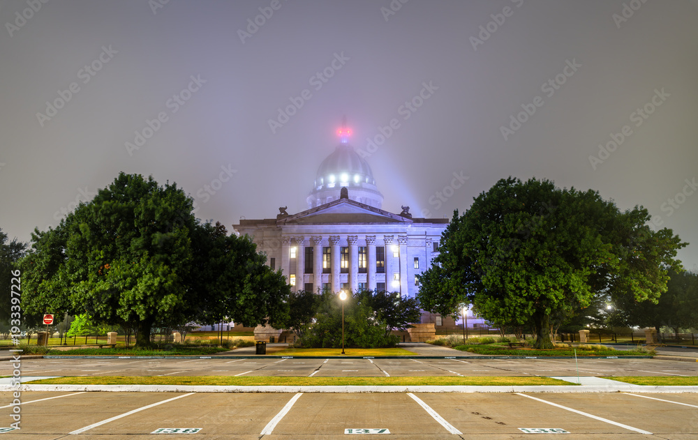 Scenic night view of the illuminated classical facade and dome of the Oklahoma State Capitol building from an empty parking lot on a foggy night in Oklahoma City, Oklahoma, United States. #1933397226